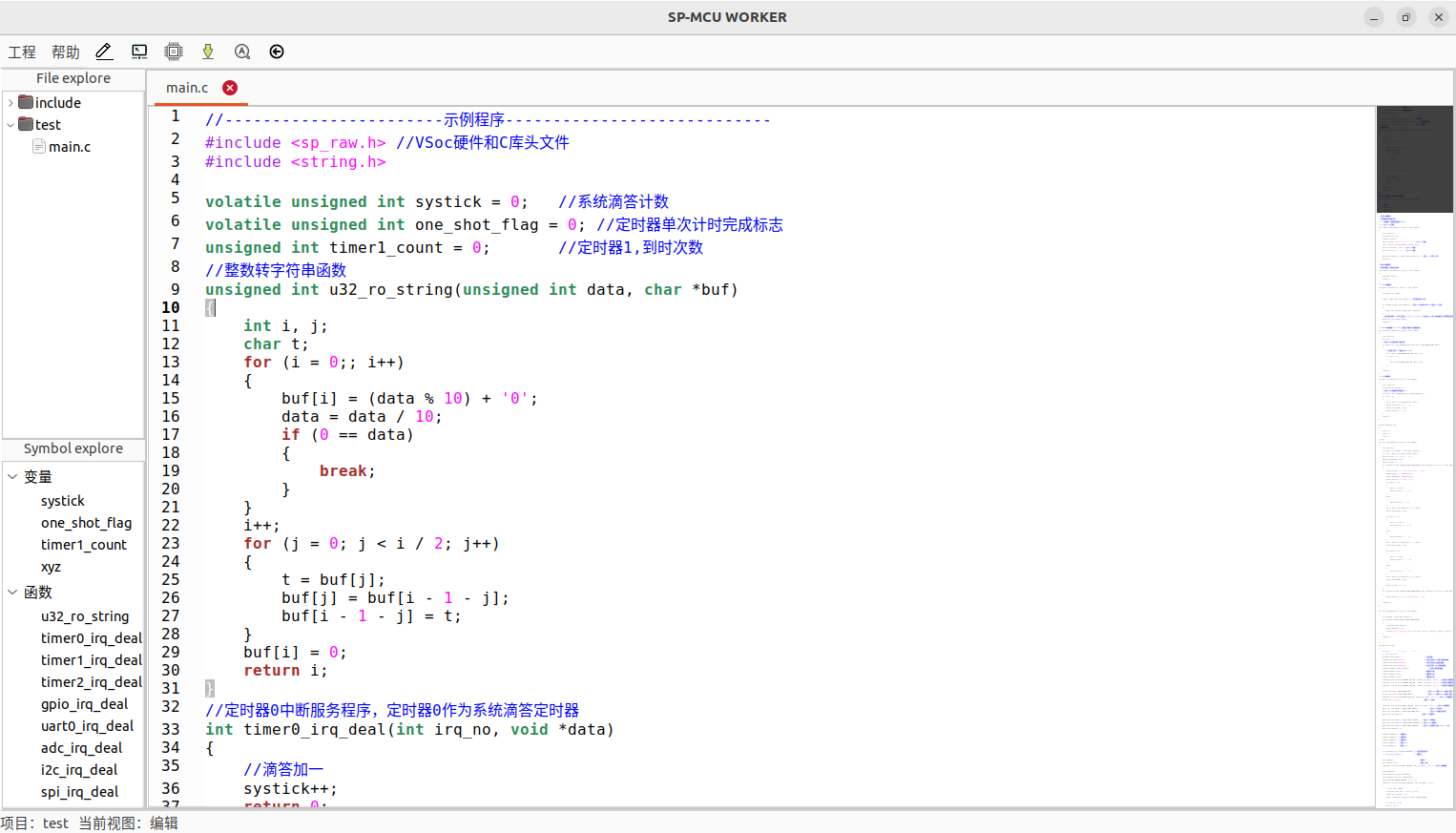 新建工程后,示例代码main.c自动加入工程,用户可以参考设计。用户可以通过左侧文件浏览器删除示例代码。